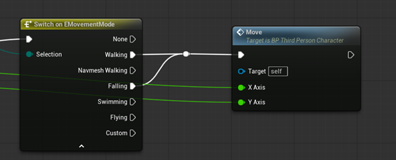 Connect IA_move to the Emovementmode. Click on the reveal arrow and Connect walking pin and falling pin to the existing movement blueprint. (you can make a junction/move joint and connect falling there)