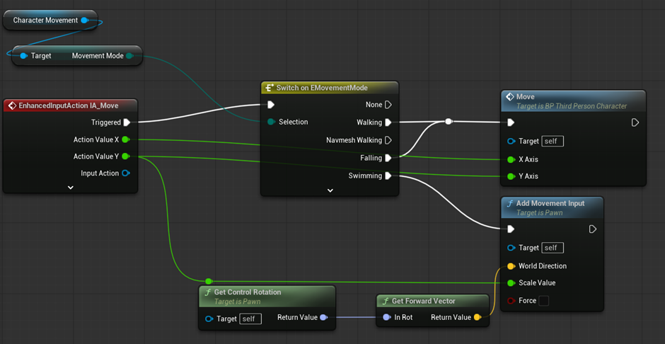 Find the movement input section of the blueprint and drag the IA_Move node to the left to make some space