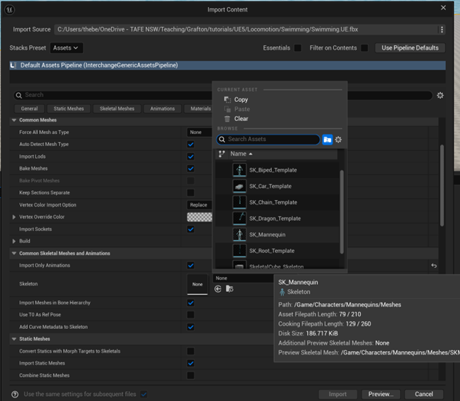 An import content window will appear and all we need to do is scroll down and under the skeleton drop down select the correct skeleton to target, since we are using the 3rd person template we will use SK_Mannequin. The animation files are also retargeted animations from mixamo.