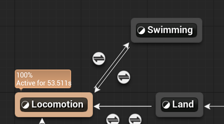 The transition will be controlled by the swimming Var. So click on the transition rule button; for locomotion to swimming the swimming bool is all you need to enter the transition.