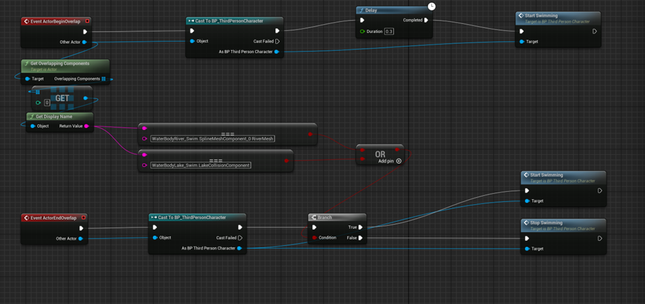 The names for the overlap that is connected from the display name can be found by doing a print string from get display name, when you are testing it will print the names out. Screen shot them and then add them to your absolute equal nodes. You will need to do this for all overlapping waterbodies. For rivers that operate on splines you will need to specify the spline number that overlaps the lake or ocean.