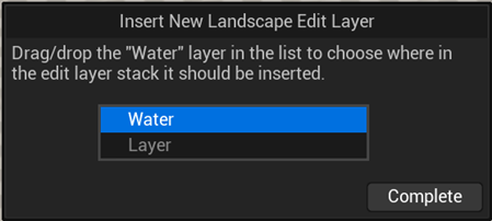 when adding the waterbody to the landscape you will now get an insert new landscape edit layer.